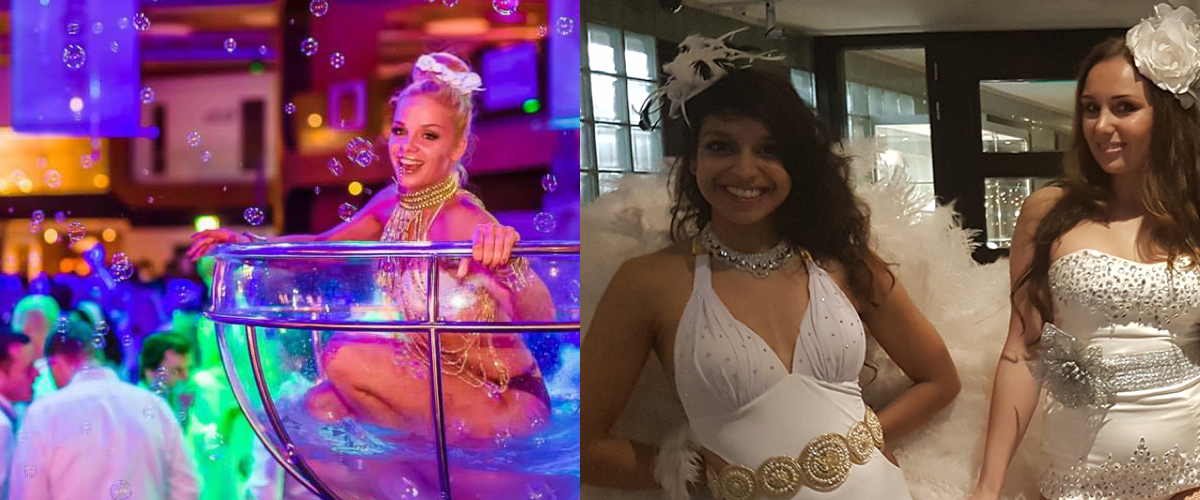 Sexy outfits, waaiers, extravagante kleding, korsetten en blingbling accessoires